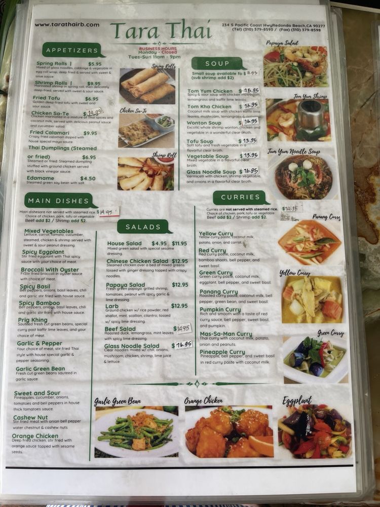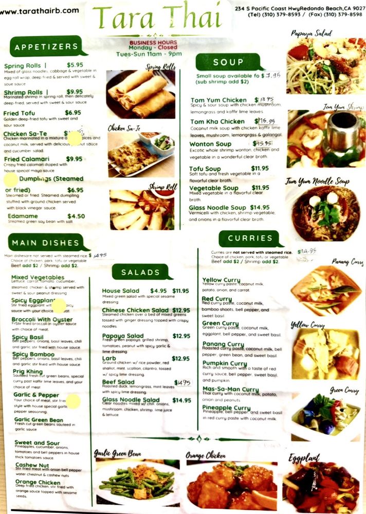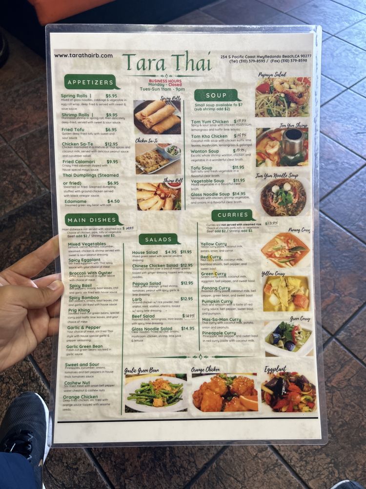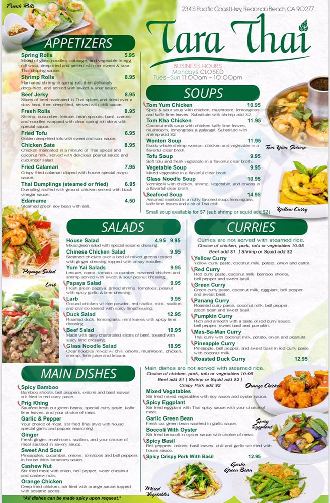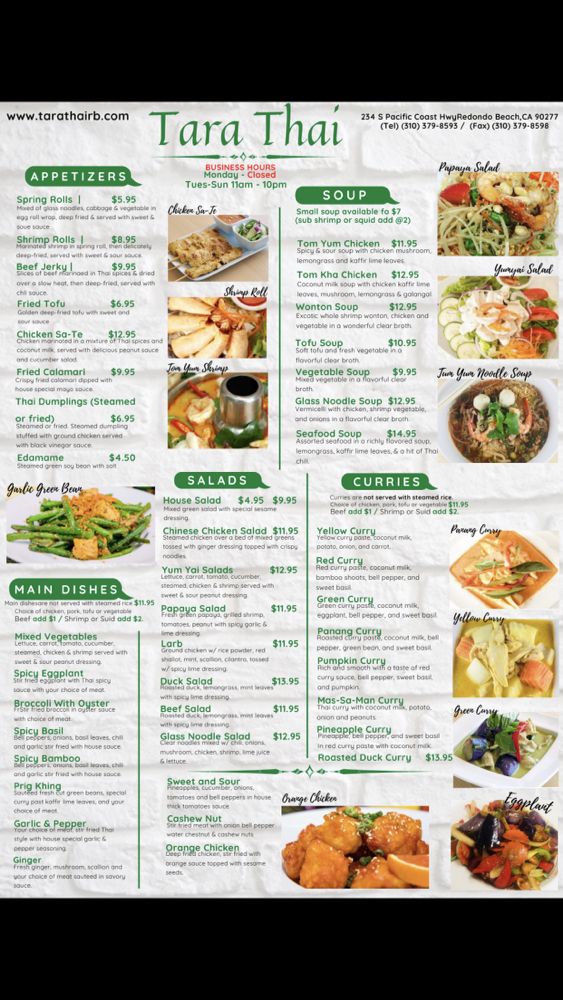 Welcome to Tara Thai Cafe, a delightful gem located at 234 S Pacific Coast Hwy, Redondo Beach, CA. This cafe specializes in authentic Thai seafood dishes that tantalize the taste buds. Each item on the menu is crafted with fresh ingredients and traditional recipes, ensuring a taste of Thailand right here on the coast.